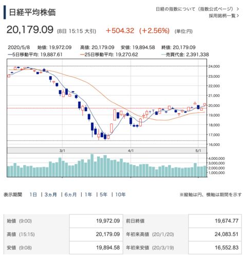 コロナ禍下のステイホーム週間明けの2020年5月8日金曜日の日経平均株価の終値は節目の2万円台超えの2万0179円09銭で引けた。