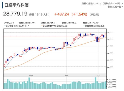 2021年2月1日週の日経平均株価は終値2万8779円19銭.レディットショックが何ごともなかったのようにショック前の水準を回復. f:id:rameninngenn:20210207171201p:plain 出典:日経平均 :国内株式 :世界の市況 :マーケット :日経電子版 https://www.nikkei.c…