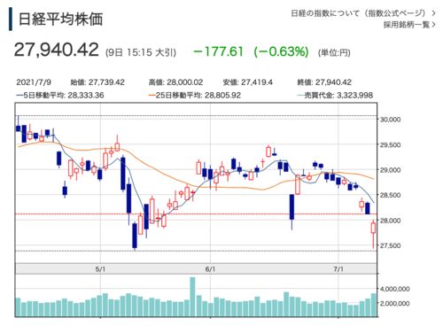 2021年7月12日週の日経平均株価は終値2万8003円08銭.新型コロナ第5波による日本経済回復遅れの懸念で日本株式市場の出遅れ感がよりより鮮明に.お盆にむけての夏枯れで一段安を試す展開になるか? f:id:rameninngenn:20210718204032p:plain 出典:日経平均…