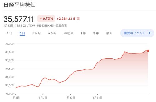 2024年1月8日週の日経平均株価終値は3万5577円11銭。5日続伸でバブル崩壊後の高値を連日更新してしまう。