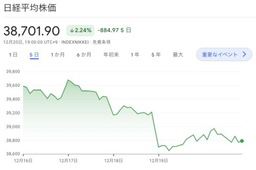 2024年12月16日週の日経平均株価終値は3万8701円90銭。米利下げ慎重姿勢でサンタラリーに影。日経平均4万円台回復どころかむしろ遠ざかる。