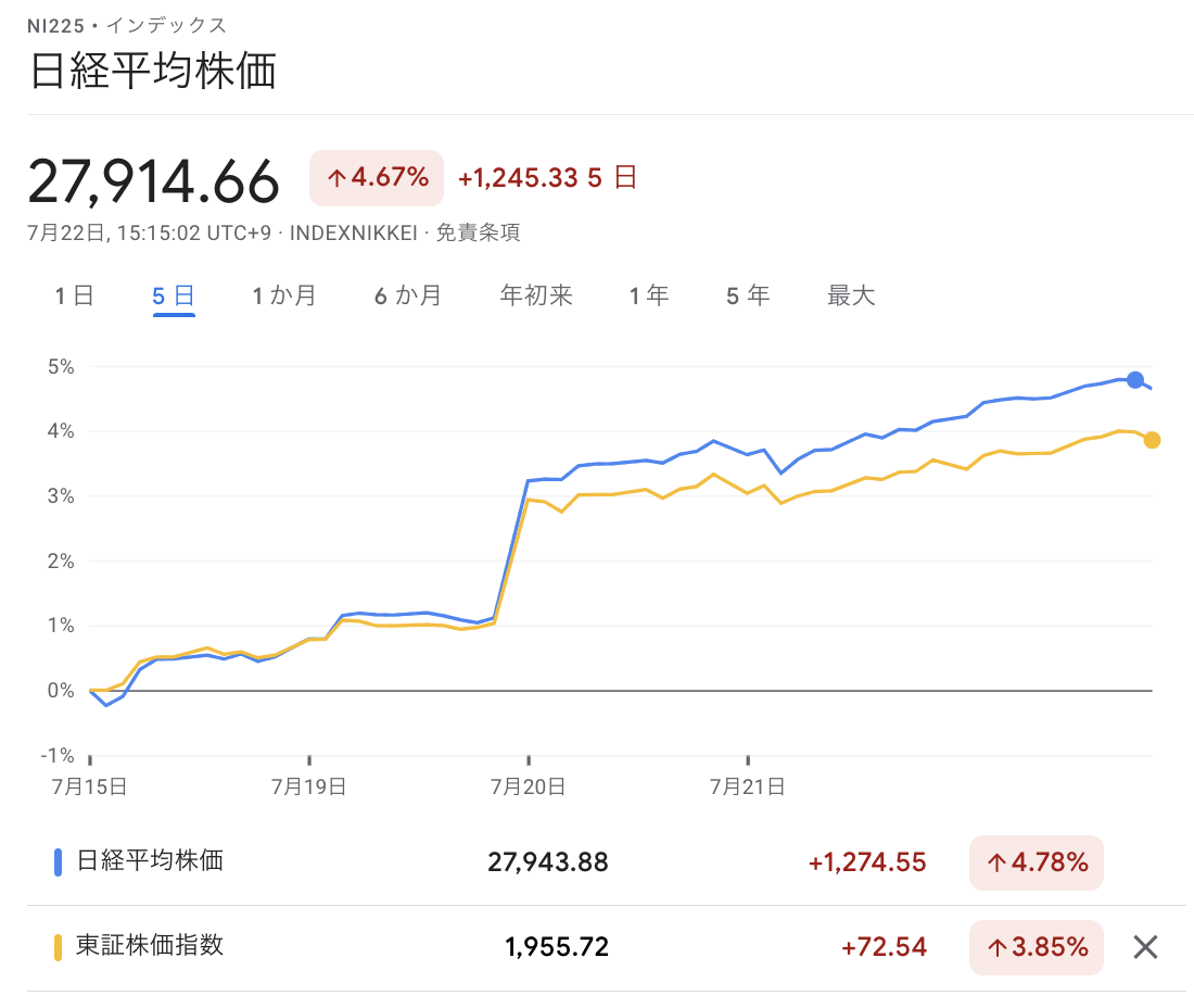 (拉麺断食之弐阡参陌弐拾弐)2022年7月18日週の日経平均株価終値は2万7914円66銭.米景気不安の高まりで米長期金利が低下し日米の金利差が縮小した結果,円高ドル安が進む。日経平均株価はまさかの7連騰.